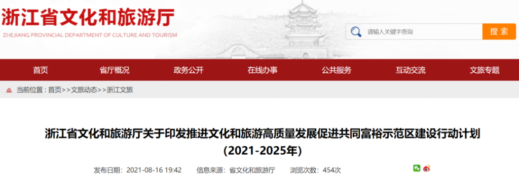 近日,浙江省文化和旅游廳印發《浙江省文化和旅游廳推進文化和旅游高質量發展促進共同富裕示范區建設行動計劃(2021-2025年)》(以下稱《計劃》)。
